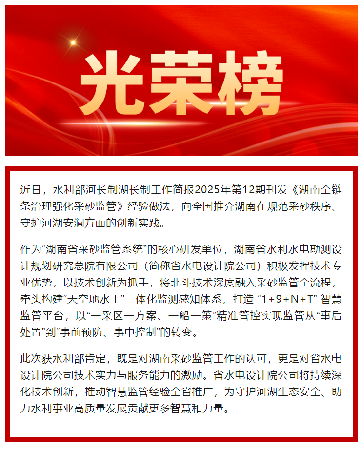 光榮榜 | 湖南采砂監(jiān)管獲水利部推介 省水電設計院公司技術支撐獲肯定