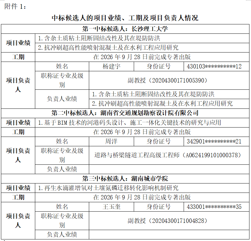 招標(biāo)人湖南省水運(yùn)建設(shè)投資集團(tuán)有限公司對(duì)沅水洪江至辰溪航道建設(shè)工程《山區(qū)高水頭船閘原址擴(kuò)能升級(jí)關(guān)鍵技術(shù)》專著編制服務(wù)(招標(biāo)編號(hào):HCHD-XJ47)進(jìn)行公開(kāi)招標(biāo),評(píng)標(biāo)委員會(huì)經(jīng)過(guò)認(rèn)真、細(xì)致的評(píng)審,推薦的中標(biāo)候選人公示如下: