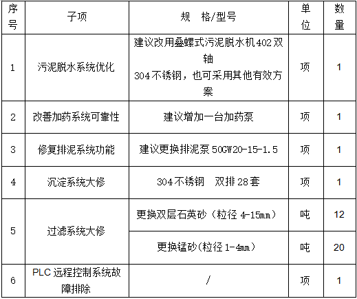 本業(yè)務(wù)主要有:岳陽城港公司碼頭污水處理系統(tǒng)(包括混凝沉淀槽、中間水槽、過濾、紫外消毒腔體等)于2020年投用,現(xiàn)存在污泥脫水設(shè)備不能正常使用、關(guān)鍵部件老化、自動化控制不穩(wěn)定等7項核心問題,嚴(yán)重影響污水處理效率及正常運用。本次改造針對污水處理站進(jìn)行系統(tǒng)性改造措施,旨在使污水管理站完全滿足港區(qū)水處理需求(50m3/h),主要內(nèi)容包括解決污泥脫水問題、恢復(fù)沉淀過濾功能、修復(fù)控制系統(tǒng)等,詳見采購需求。