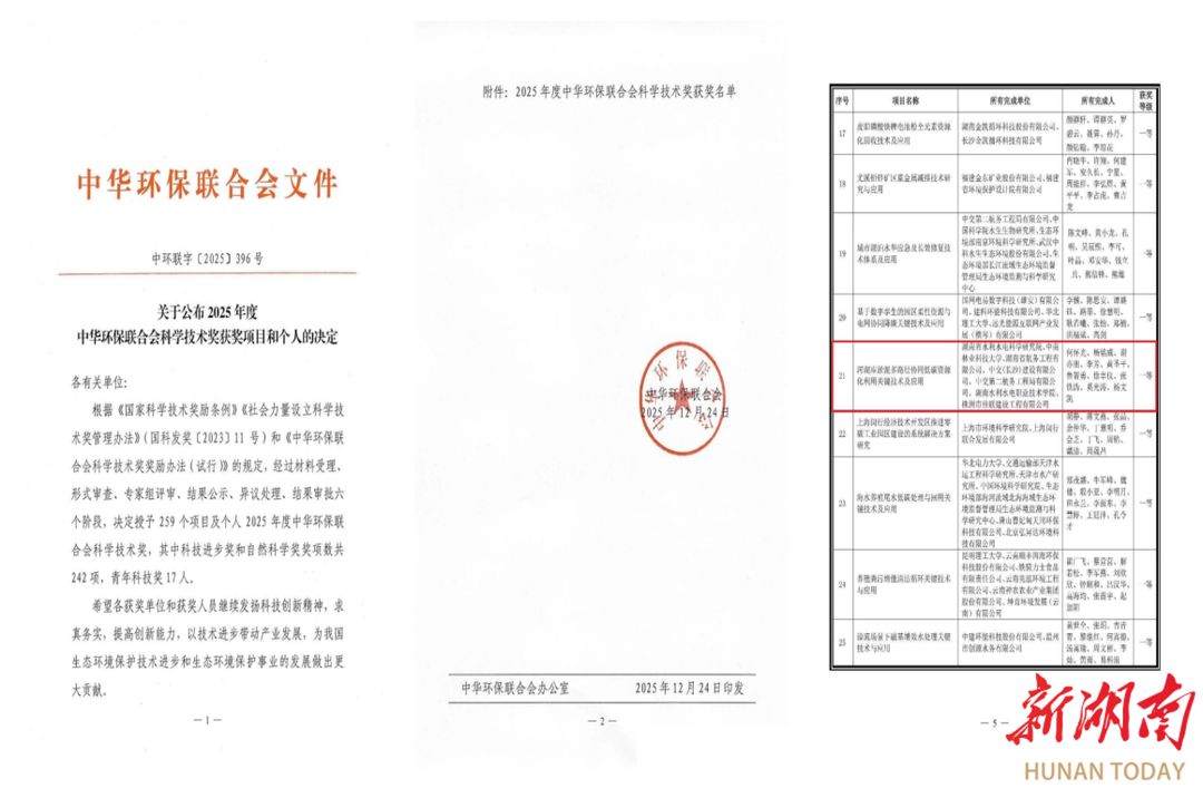 新湖南客戶端12月29日訊(通訊員 李智勇 黃圣平 陳南松)近日,2025年度中華環(huán)保聯(lián)合會(huì)科學(xué)技術(shù)獎(jiǎng)獲獎(jiǎng)名單正式揭曉,湖南港航水利集團(tuán)所屬湖南省航務(wù)工程有限公司(簡(jiǎn)稱航務(wù)公司)作為主要完成單位申報(bào)的“河湖庫淤泥多路徑協(xié)同低碳資源化利用關(guān)鍵技術(shù)及應(yīng)用”項(xiàng)目榮獲一等獎(jiǎng)。該獎(jiǎng)項(xiàng)是經(jīng)科技部正式備案的全國性權(quán)威獎(jiǎng)項(xiàng),是我國生態(tài)環(huán)境保護(hù)領(lǐng)域最具影響力的科技獎(jiǎng)項(xiàng)之一,旨在表彰和獎(jiǎng)勵(lì)在生態(tài)環(huán)境保護(hù)及相關(guān)技術(shù)服務(wù)領(lǐng)域作出突出貢獻(xiàn)的單位和個(gè)人。