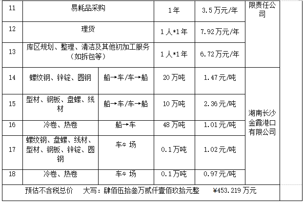合同包三:湖南省城陵磯港口集團(tuán)長(zhǎng)沙港區(qū)2026-2027年件雜貨裝卸勞務(wù)外包項(xiàng)目,本項(xiàng)目包括但不限于長(zhǎng)沙新港港區(qū)鋼板、軟板、冷卷、熱卷、螺紋鋼、盤圓(含盤條、盤螺、線材)的場(chǎng)?車、火?場(chǎng)(車)、場(chǎng)-場(chǎng)/ 庫(kù)-庫(kù)等裝卸作業(yè),以及熱卷鋼帶打托、油布折疊裝車運(yùn)輸卸車、附加作業(yè)計(jì)時(shí)等相關(guān)輔助作業(yè);長(zhǎng)沙新港凱達(dá)供應(yīng)鏈管理有限責(zé)任公司(以下簡(jiǎn)稱“凱達(dá)公司”)3號(hào)倉(cāng)庫(kù)內(nèi)所需的裝卸、簡(jiǎn)易加工、易耗品采購(gòu)(倉(cāng)庫(kù)、辦公用品)、理貨(收發(fā)貨)、庫(kù)區(qū)規(guī)劃整理、數(shù)據(jù)系統(tǒng)軟件使用(WMS系統(tǒng)、物流配送系統(tǒng)、生產(chǎn)作業(yè)系統(tǒng))、安全管理、環(huán)保衛(wèi)生等;湖南長(zhǎng)沙金霞港口有限公司(以下簡(jiǎn)稱“金霞港”)港區(qū)內(nèi)冷卷、熱卷、鋼板、型材、圓鋼、螺紋鋼和盤螺等鋼材貨品的中轉(zhuǎn)裝卸、堆場(chǎng)倉(cāng)儲(chǔ)裝卸作業(yè)(不含由火車經(jīng)長(zhǎng)沙北汽運(yùn)到達(dá)碼頭的熱卷、冷卷卸車裝船)。