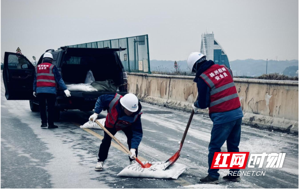 履行社會(huì)責(zé)任。在冰凍嚴(yán)重的跨閘公路橋,景象尤為緊張忙碌。由一線職工組成的志愿服務(wù)隊(duì),利用鐵鍬、掃帚等除雪工具,反復(fù)清除橋面積雪積冰,及時(shí)鋪撒防滑材料,保障公共通道人車安全。