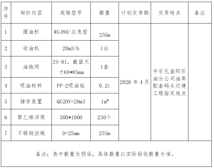 1、本次詢價(jià)項(xiàng)目為湖南省航務(wù)工程有限公司中石化益陽石油分公司油庫配套碼頭遷建工程應(yīng)急物資材料采購。